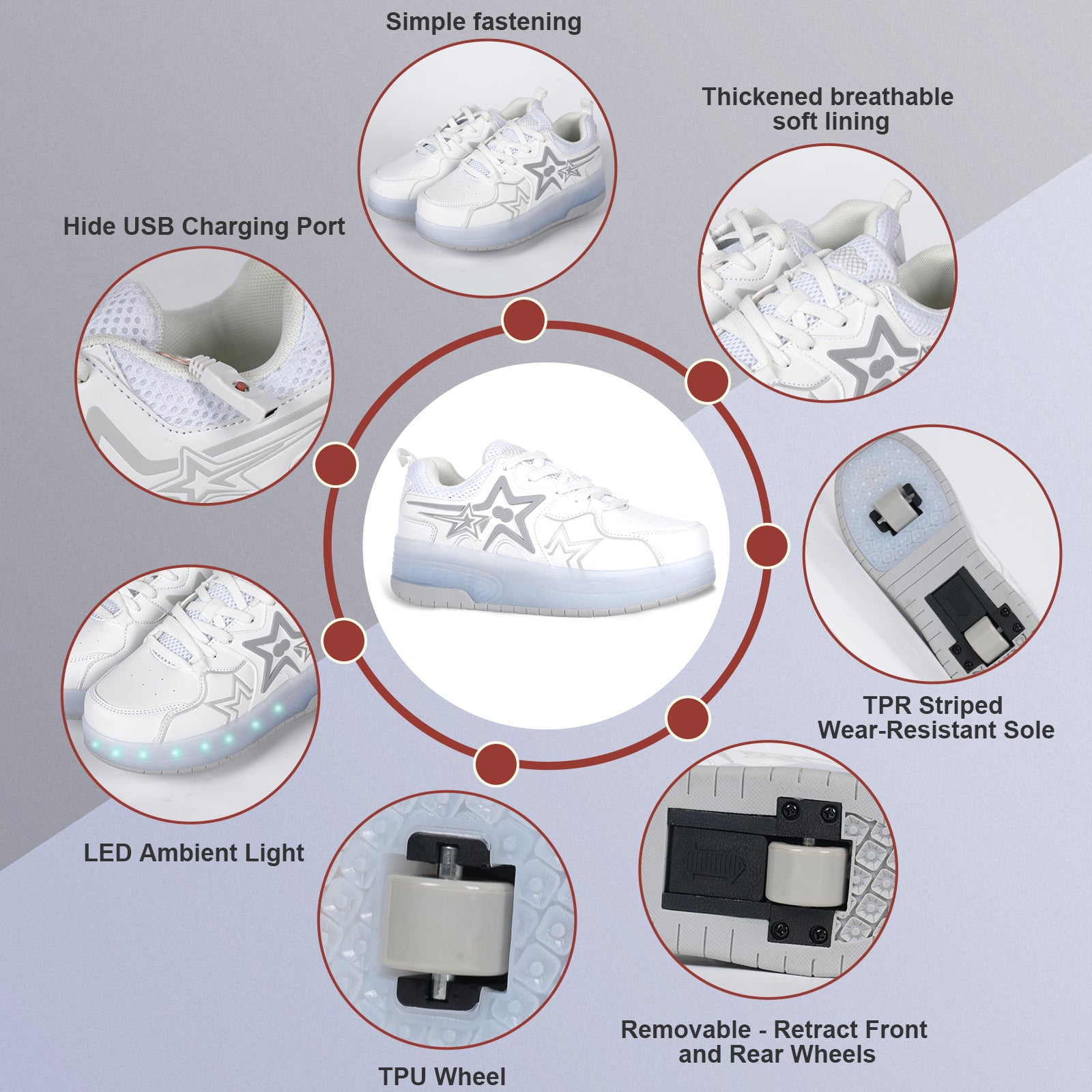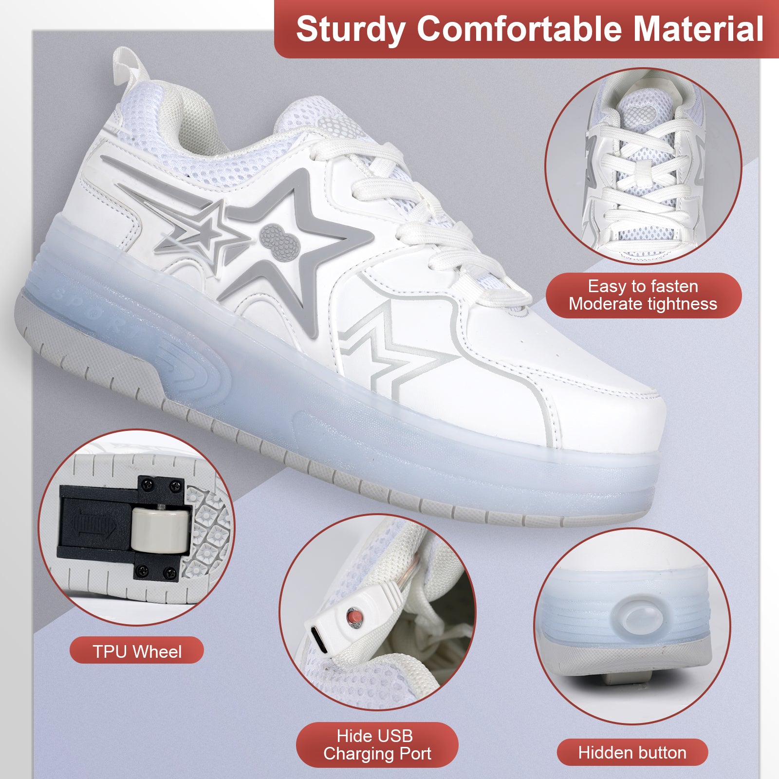 Unsere Rollschuhschuhe wurden speziell für alle Rollschuhliebhaber entwickelt. Bequeme Sneaker mit Pop-up-Rädern eignen sich zum Laufen, Walken und Skaten. Sie brauchen nicht mehrere Schuhe, um das Beste aus Ihrem Leben zu machen. Machen Sie einen Spaziergang oder joggen Sie, und wenn Sie zum Skaten bereit sind, verriegeln und entriegeln Sie einfach den Schalter und bringen Sie die Räder ins Rollen und gleiten Sie in Ihre Richtung.