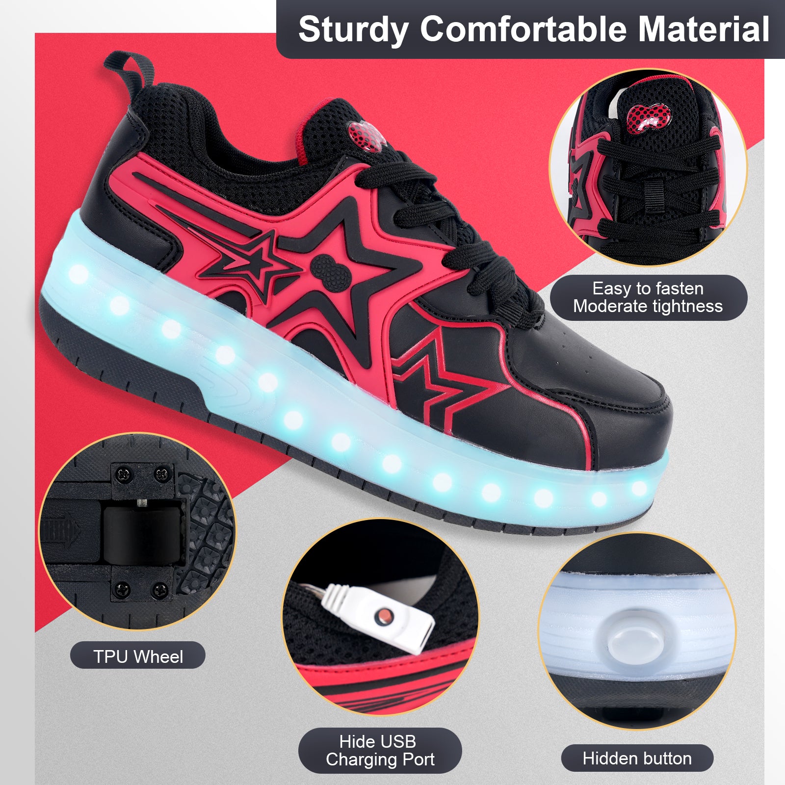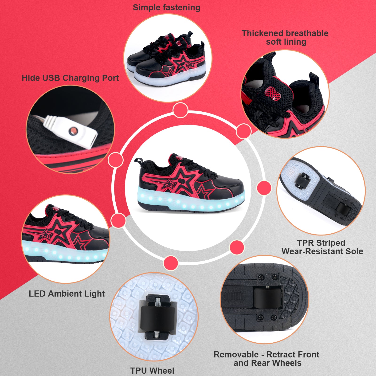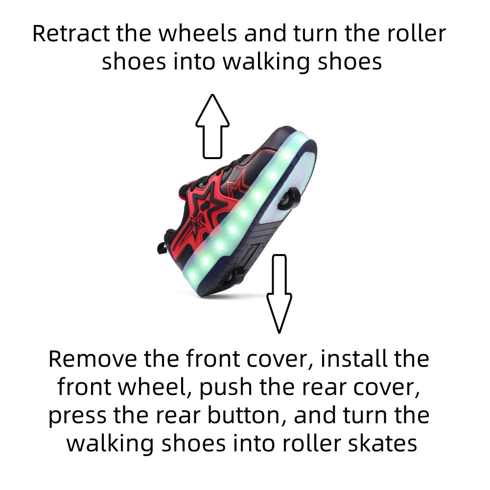 Unsere Rollschuhschuhe wurden speziell für alle Rollschuhliebhaber entwickelt. Bequeme Sneaker mit Pop-up-Rädern eignen sich zum Laufen, Walken und Skaten. Sie brauchen nicht mehrere Schuhe, um das Beste aus Ihrem Leben zu machen. Machen Sie einen Spaziergang oder joggen Sie, und wenn Sie zum Skaten bereit sind, verriegeln und entriegeln Sie einfach den Schalter und bringen Sie die Räder ins Rollen und gleiten Sie in Ihre Richtung.
